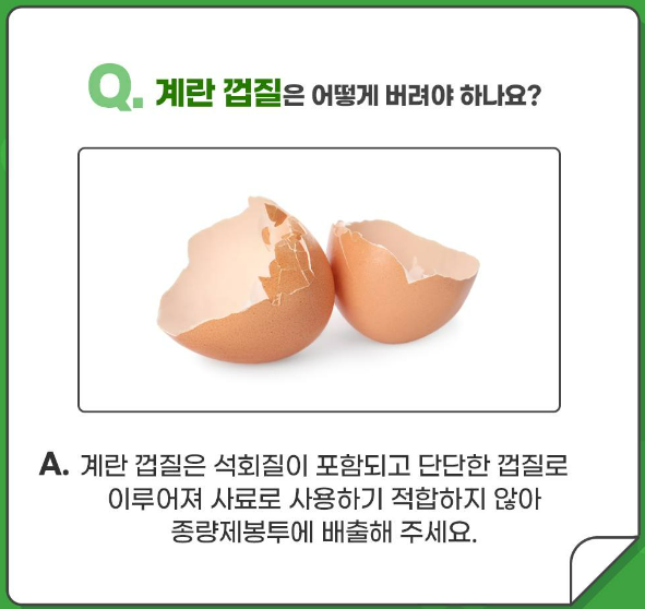 | 어패류 | 홍합, 조개, 소라, 전복, 꼬막, 멍게, 굴 등의 패류 껍데기 |