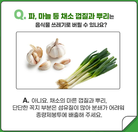| 양파, 마늘, 생강, 옥수수 껍질 등 (가축의 소화능력을 떨어뜨리는 성분이 있어 일반쓰레기로 배출) | |