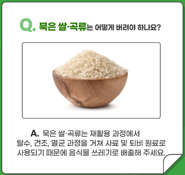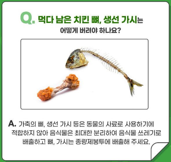 | 소금성분이 많은 김치류는 물에 헹구어 음식물쓰레기로 배출 그렇지 않다면 일반쓰레기로 배출 |